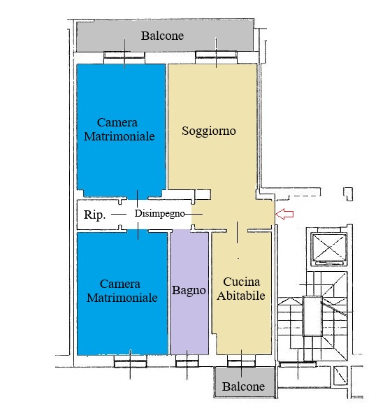Così composto: Ingresso, soggiorno con accesso ad un balcone vivibile, cucina abitabile con accesso ad un secondo balcone, disimpegno, 2 camere matrimoniali, bagno, ripostiglio e cantina.