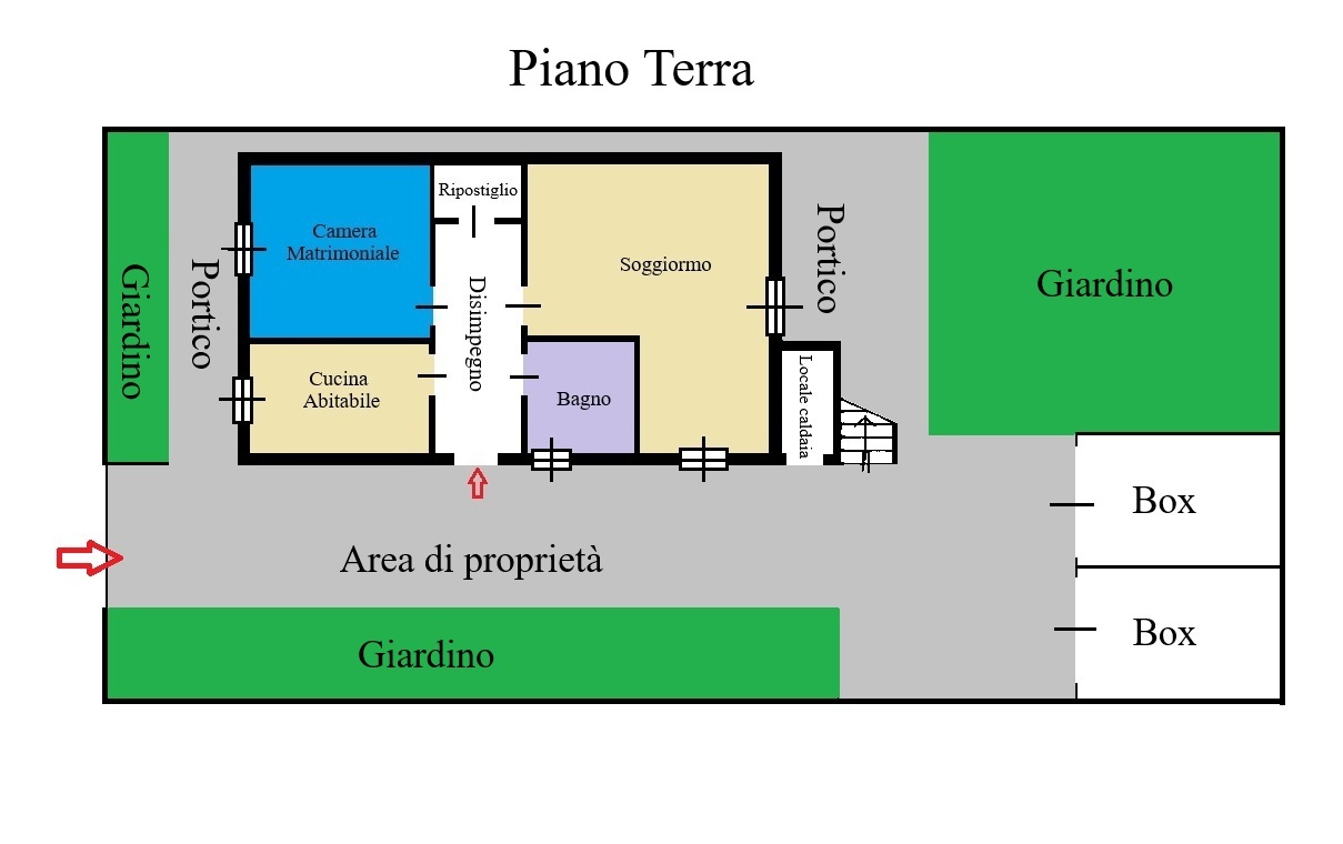 – Piano terra: ingresso, cucina abitabile, soggiorno doppio, bagno finestrato, camera matrimoniale e ripostiglio, area esterna di proprietà di circa 350 mq oltre 2 comodi box auto;