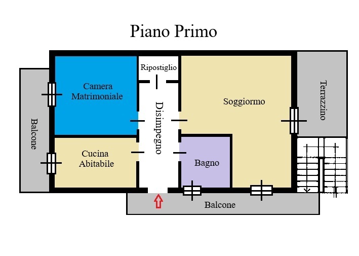 – Piano primo: ingresso, cucina abitabile, soggiorno doppio, bagno finestrato, camera matrimoniale e ripostiglio, 2 balconi ed un terrazzino;
